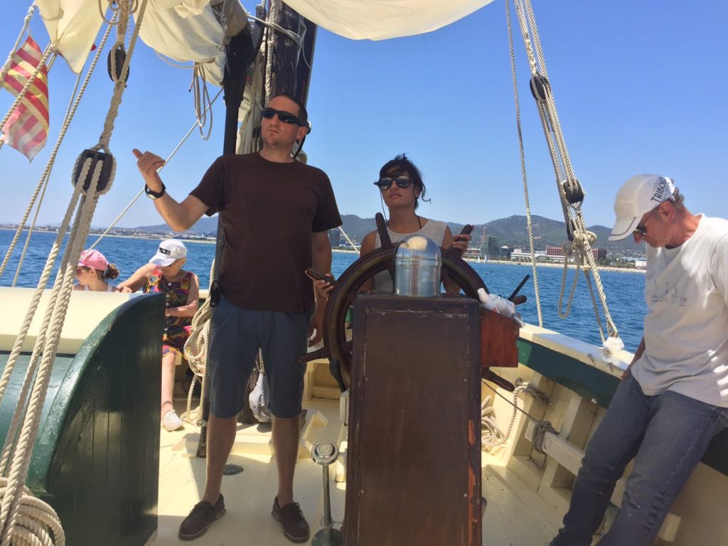La segunda actividad náutica conjunta fue un paseo en el laúd Sant Ramón, un barco construido en 1904 que lo mueve una tripulación de diez marineros. Es uno de los barcos de vela latina más antiguos y grandes de los que navegan por el mediterráneo. Esta vez pudimos disfrutar de un agradable paseo viendo el skyline de Mataró e incluso algunos valientes nos decidimos a coger el timón y aprender a dirigirlo.